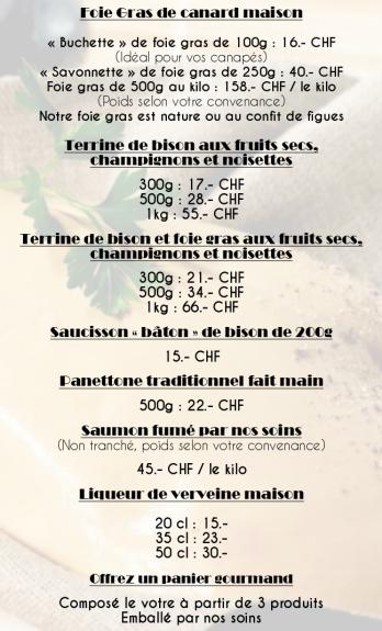 notre saumon fumé maison, notre liqueur de verveine maison et nos panettones artisanaux.